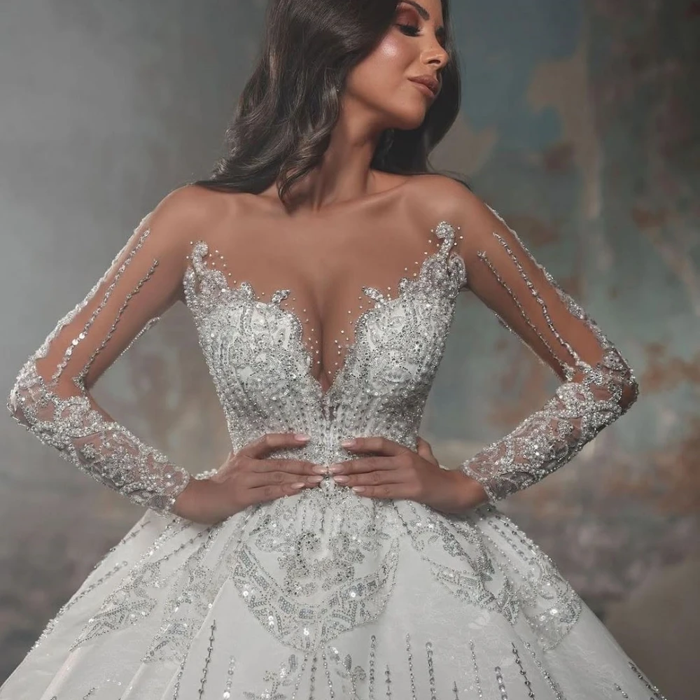 Barato e Desconto Ilusão frisado vestido de casamento de manga longa com trem luxuoso o-pescoço vestido de noiva personalizado sonhador vestidos longos para noiva Atacado. Compre diretamente da YiWANNA01 Official Store.